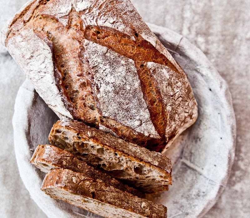 Pain de Campagne : Un pain rustique avec une croûte épaisse et une mie aérée, souvent fabriqué avec une farine de blé mélangée à de la farine de seigle pour un goût unique.